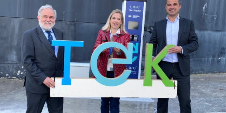 José Ignacio Zudaire, Petronorren CEOaren albokoa, Ainara Leiba, Muskizko alkatea, eta Borja Holiguera, Industria Poligonoaren ordezkaria, TEKaren aurkezpenean.