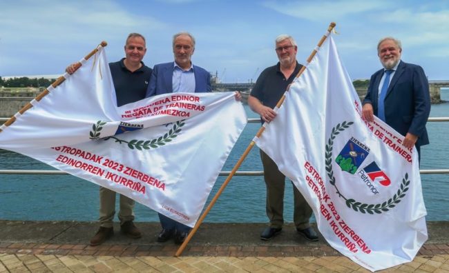 Zierbenako Arraun Elkarteak aurkeztu zituen atzo, datorren igandean Zierbenako kostaldean jokatuko diren bi estropadetako banderak: gizonezkoen XL. Petronor Bandera eta emakumezkoen III. Edinor Bandera.